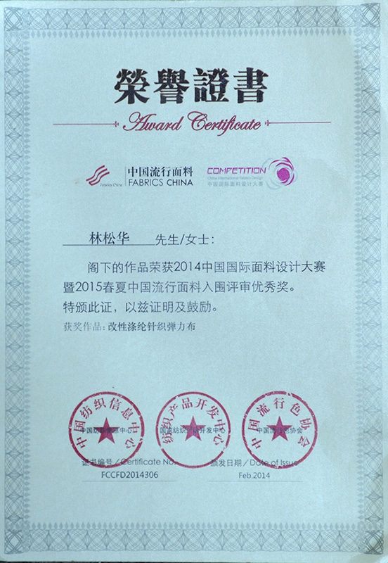 國際面料設(shè)計(jì)大賽優(yōu)秀獎(jiǎng)